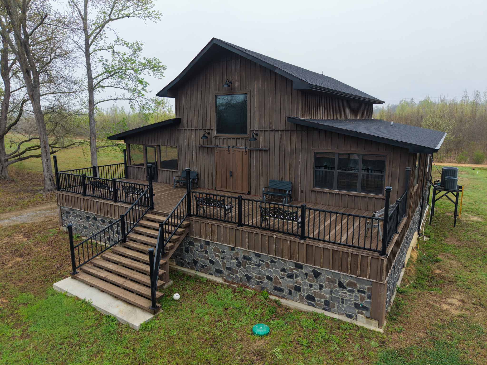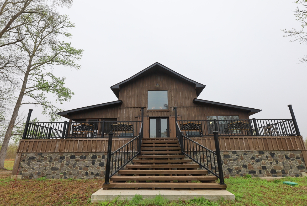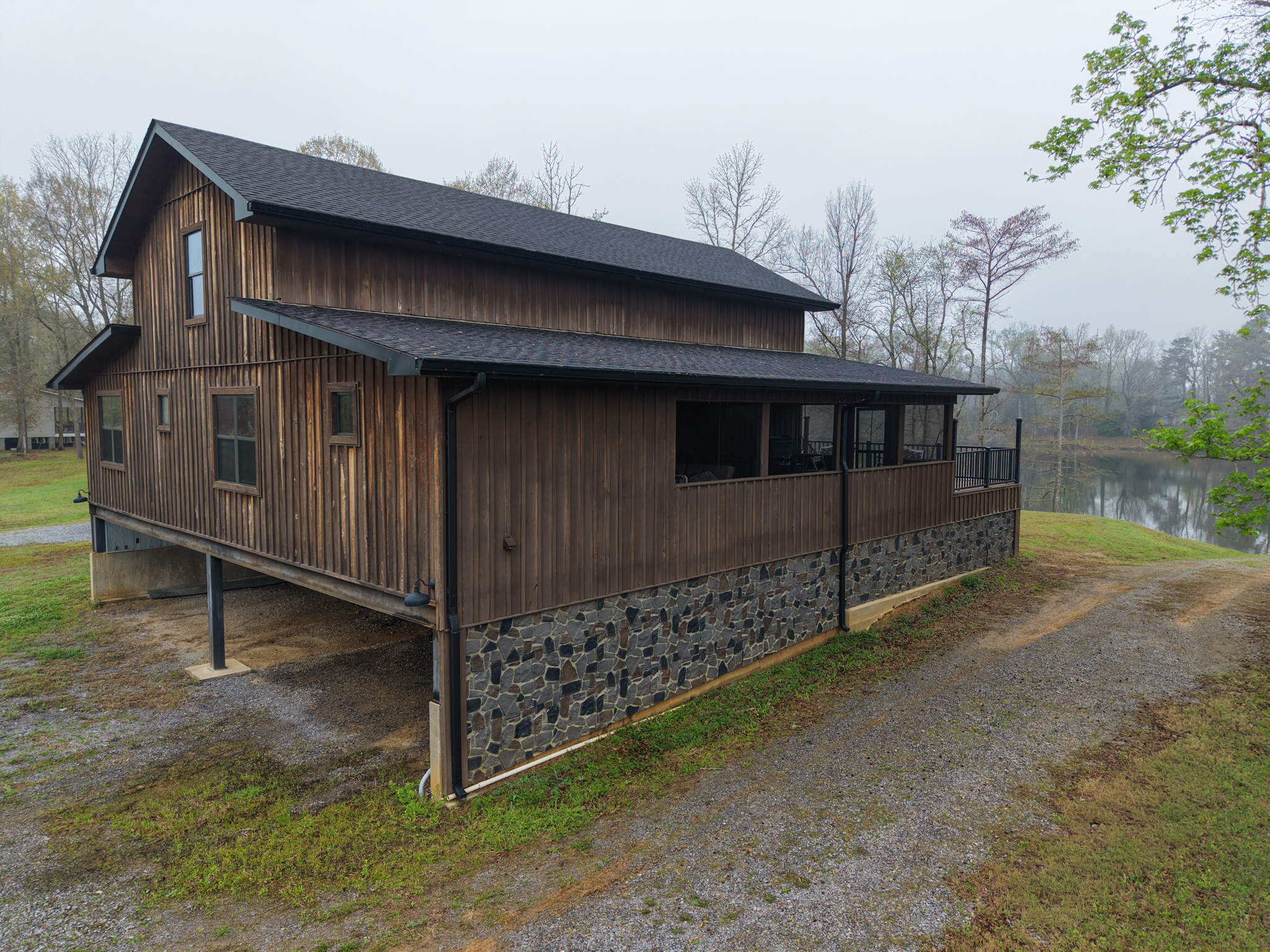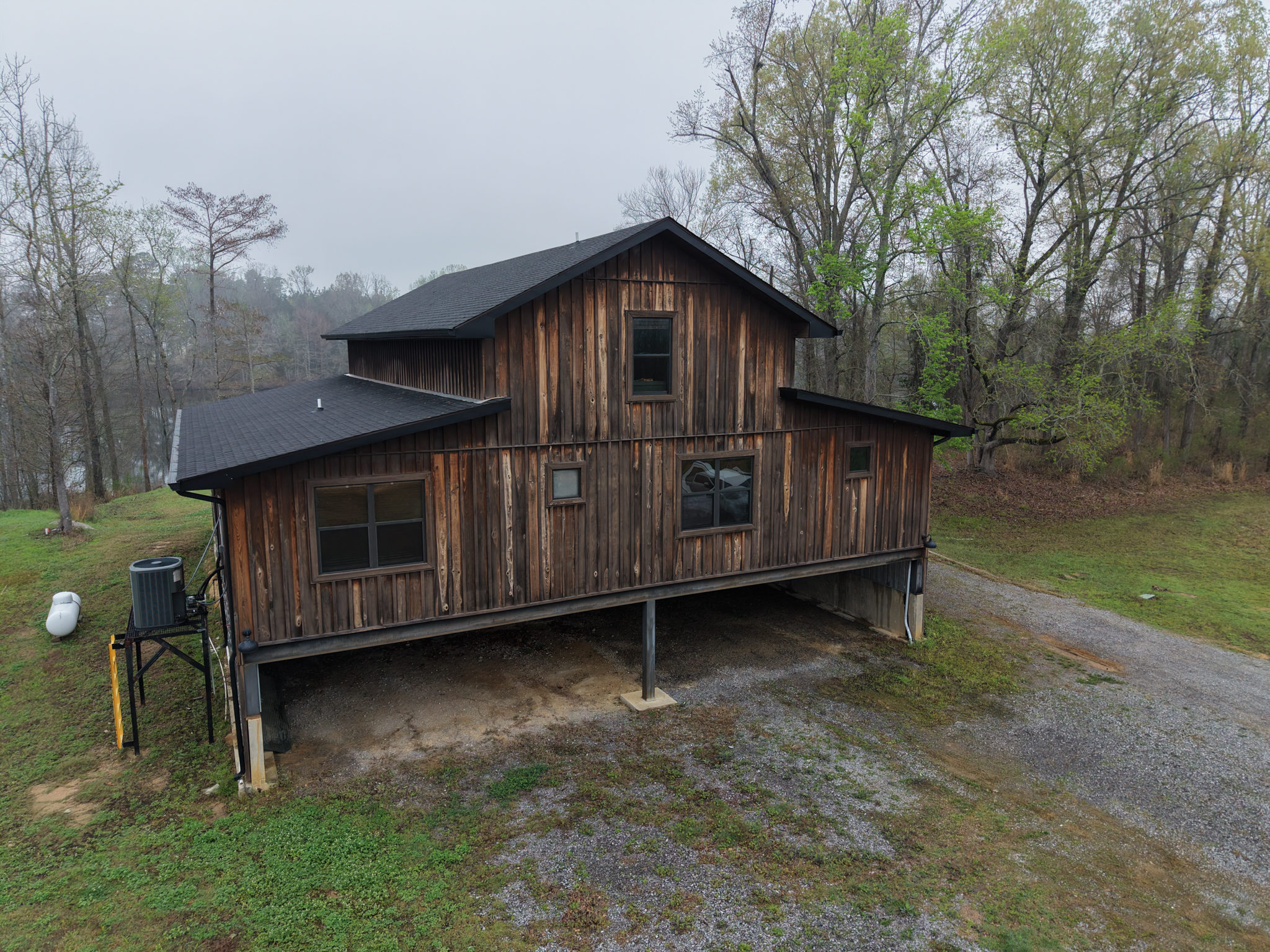 The camp was built in 2021 and has cypress siding, metal roof and a gutter system. Underneath the camp there is ample parking for four vehicles- the camp can be accessed from underneath parking area that allows for access in wet weather without getting wet.