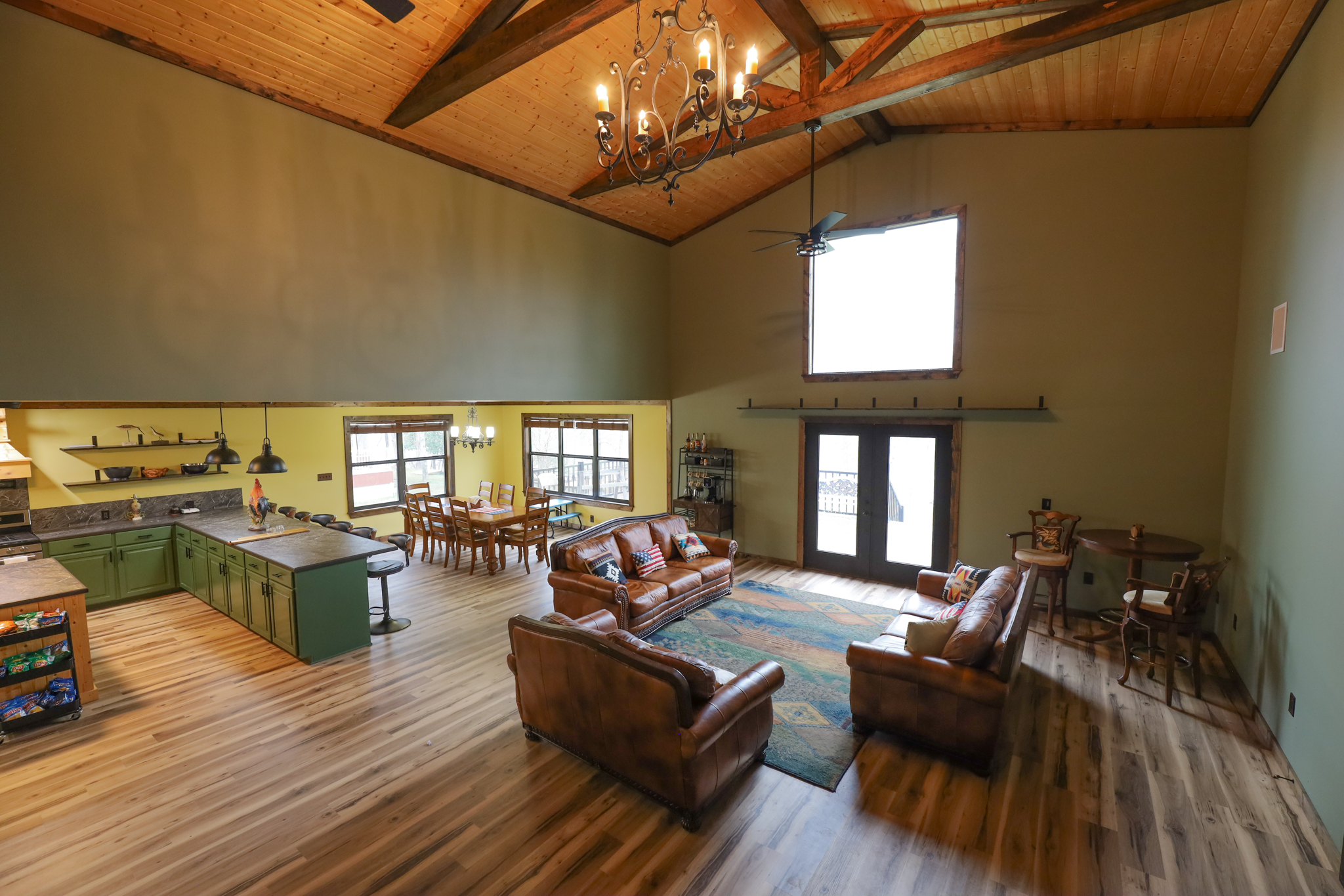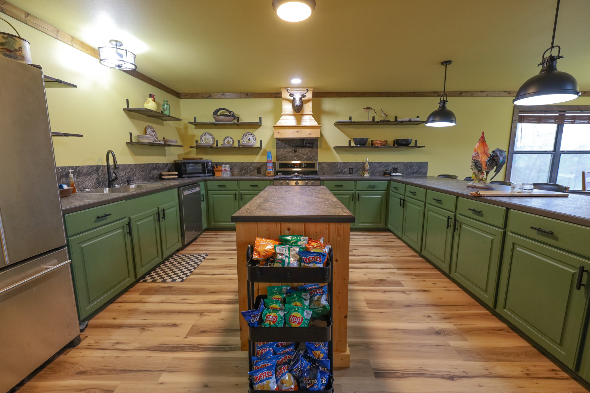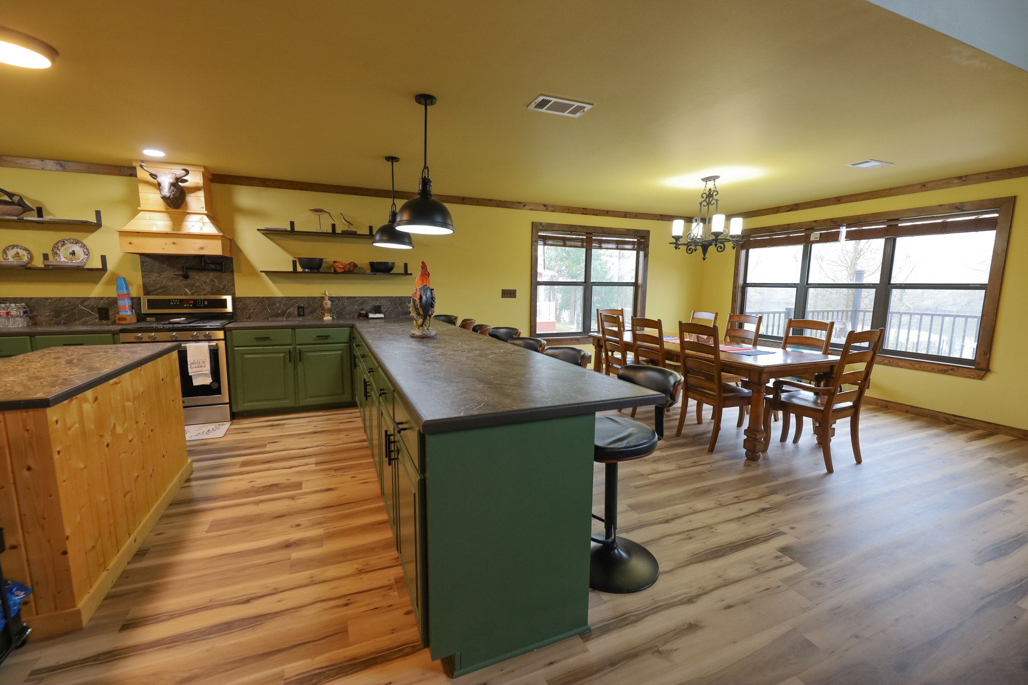 The camp has 2.065+/- square feet of living space, with a large living room, with high ceilings, and exposed beams. The open floor plan in the kitchen has plenty of room for entertaining and cooking. Stainless steel appliances include gas stove, dishwasher, and refrigerator. Kitchen and living room area have great views of the lake.
