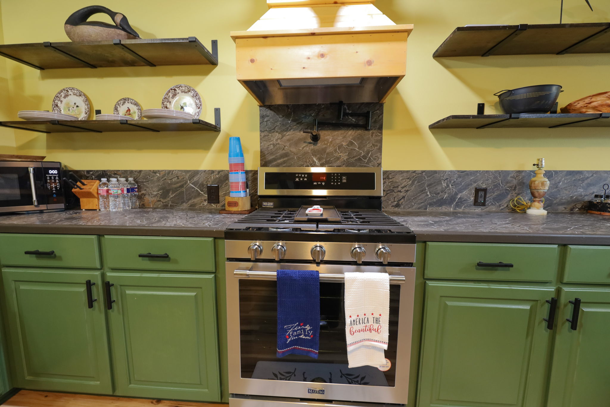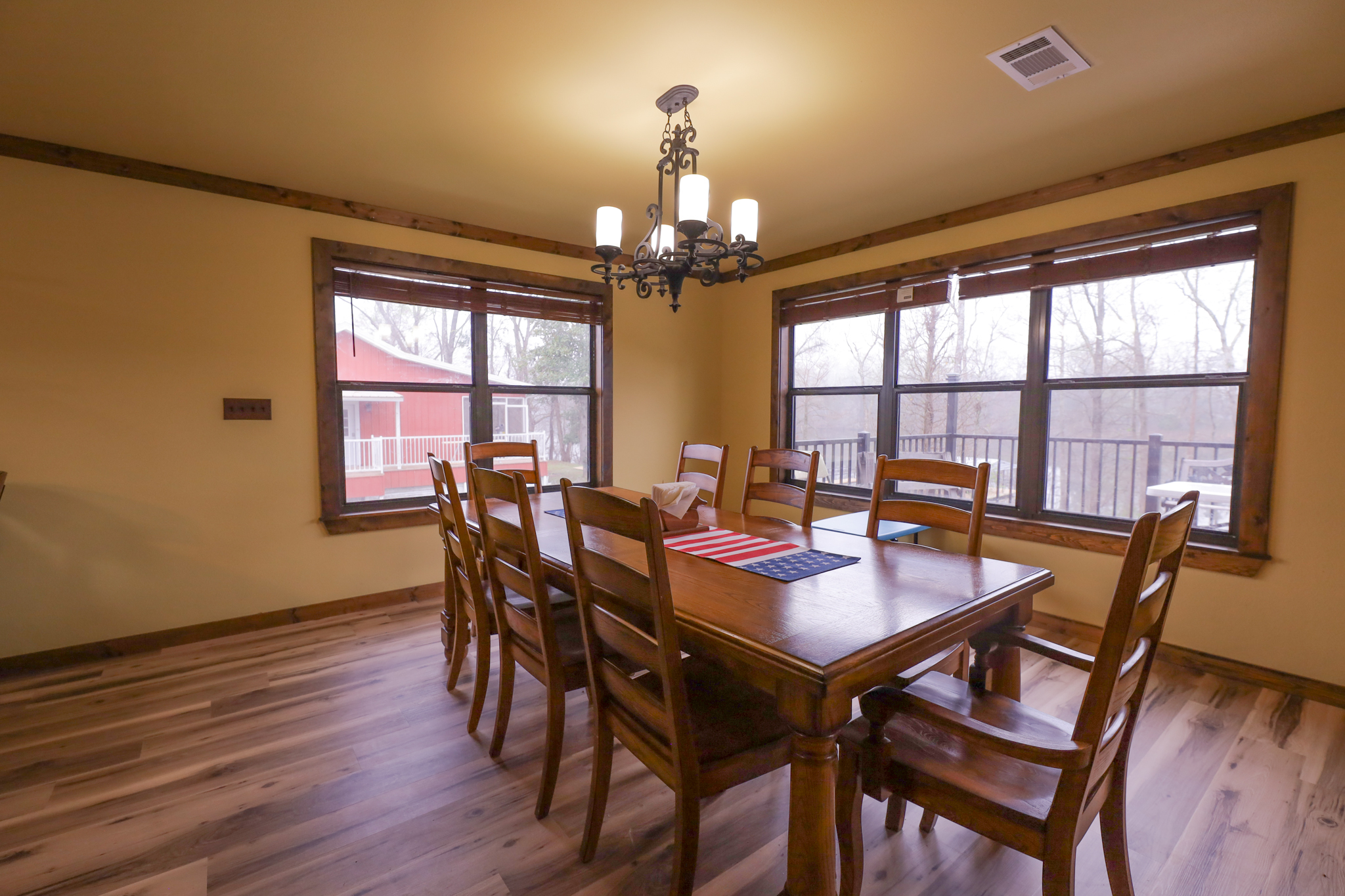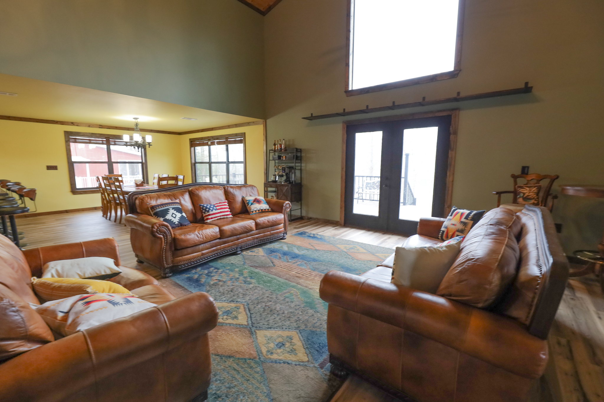 The camp has 2.065+/- square feet of living space, with a large living room, with high ceilings, and exposed beams. The open floor plan in the kitchen has plenty of room for entertaining and cooking. Stainless steel appliances include gas stove, dishwasher, and refrigerator. Kitchen and living room area have great views of the lake.