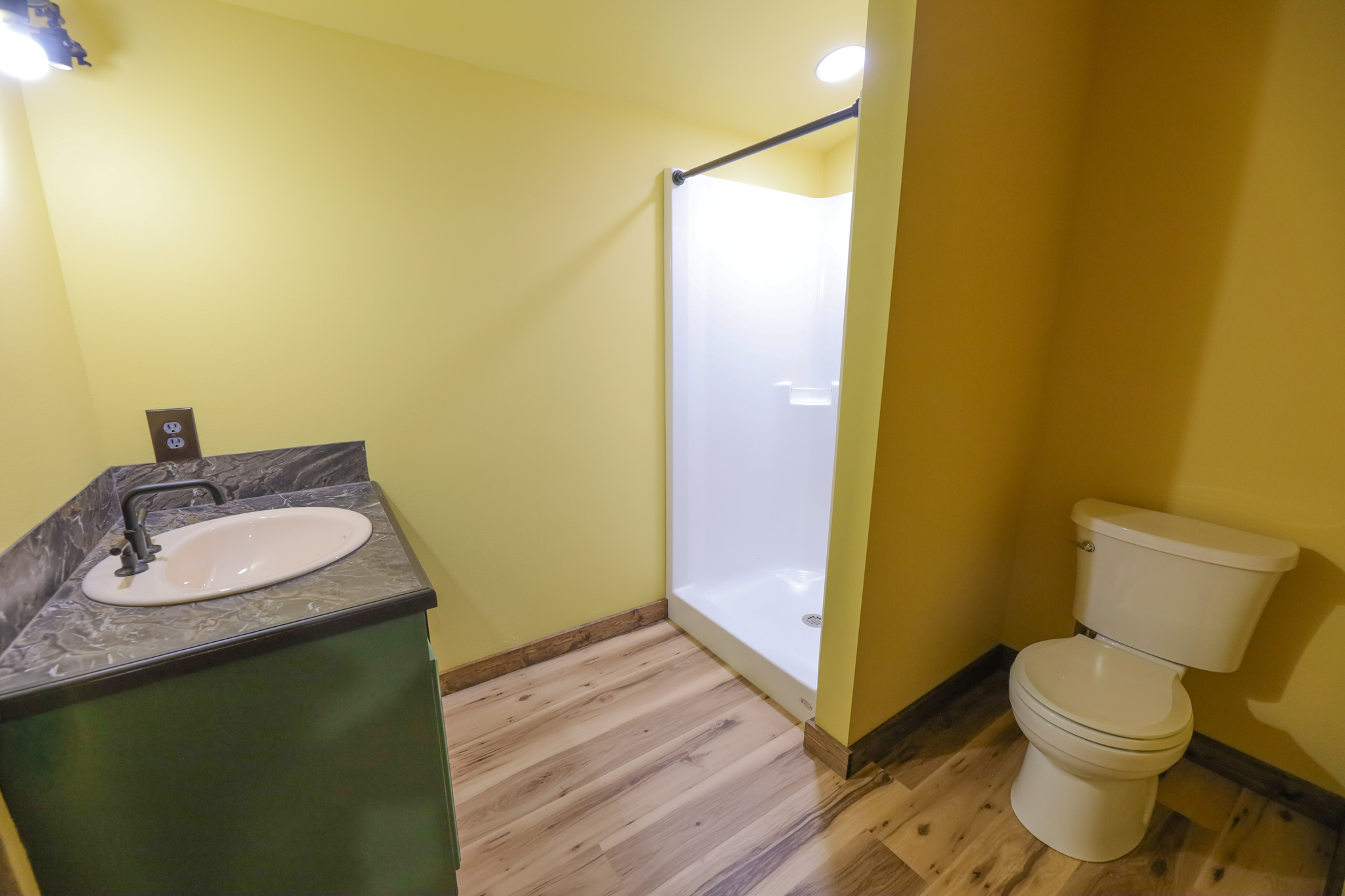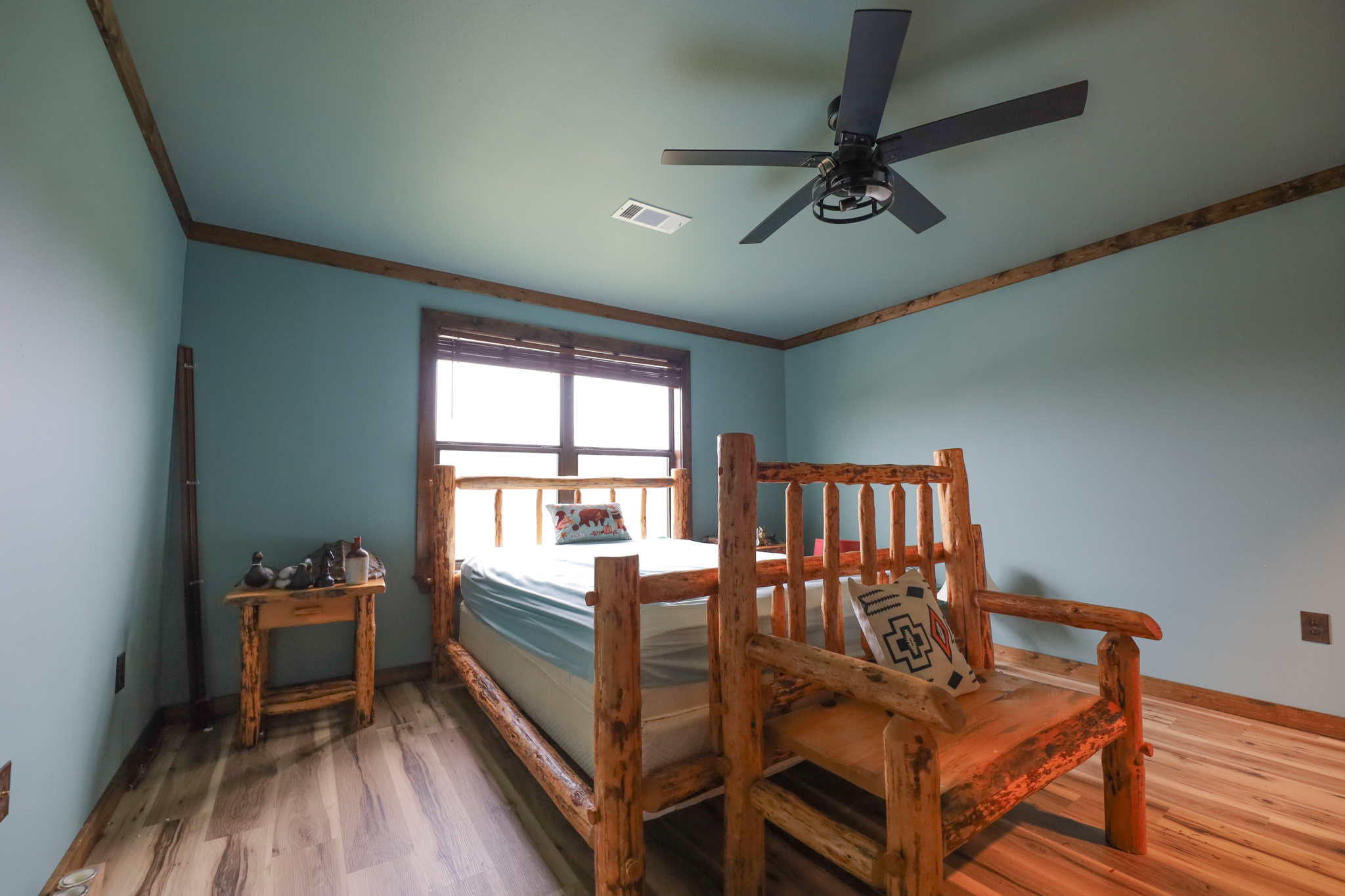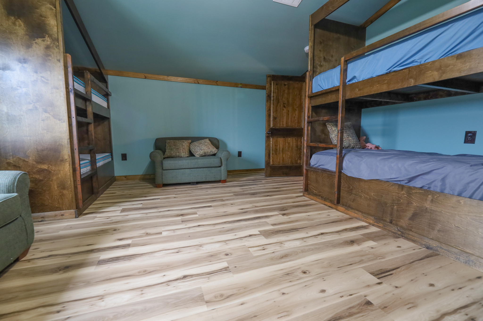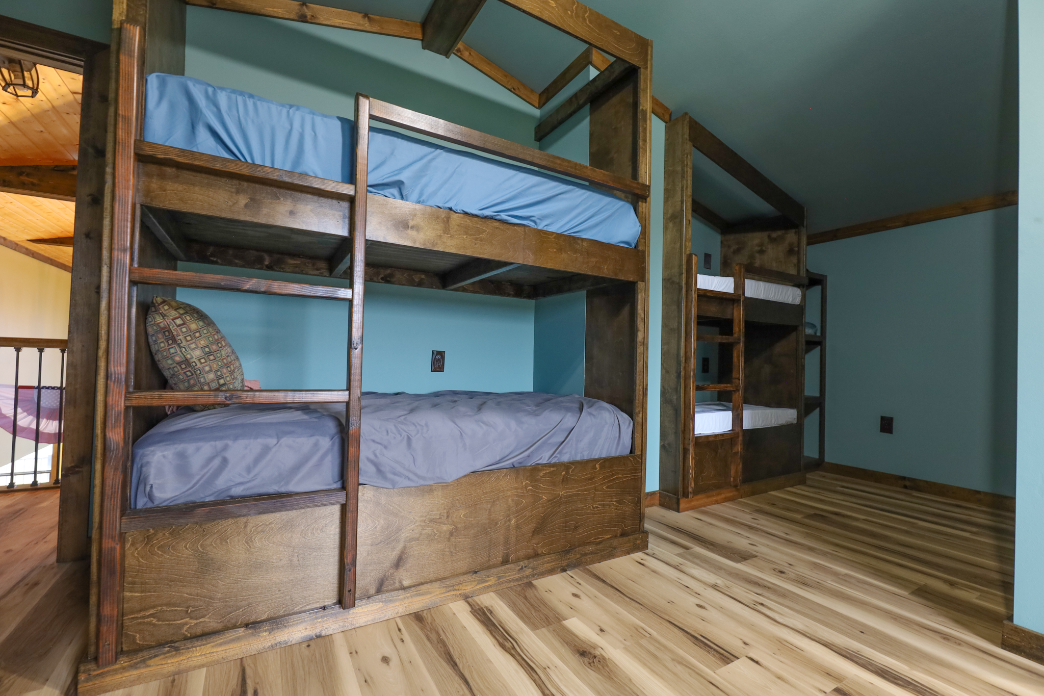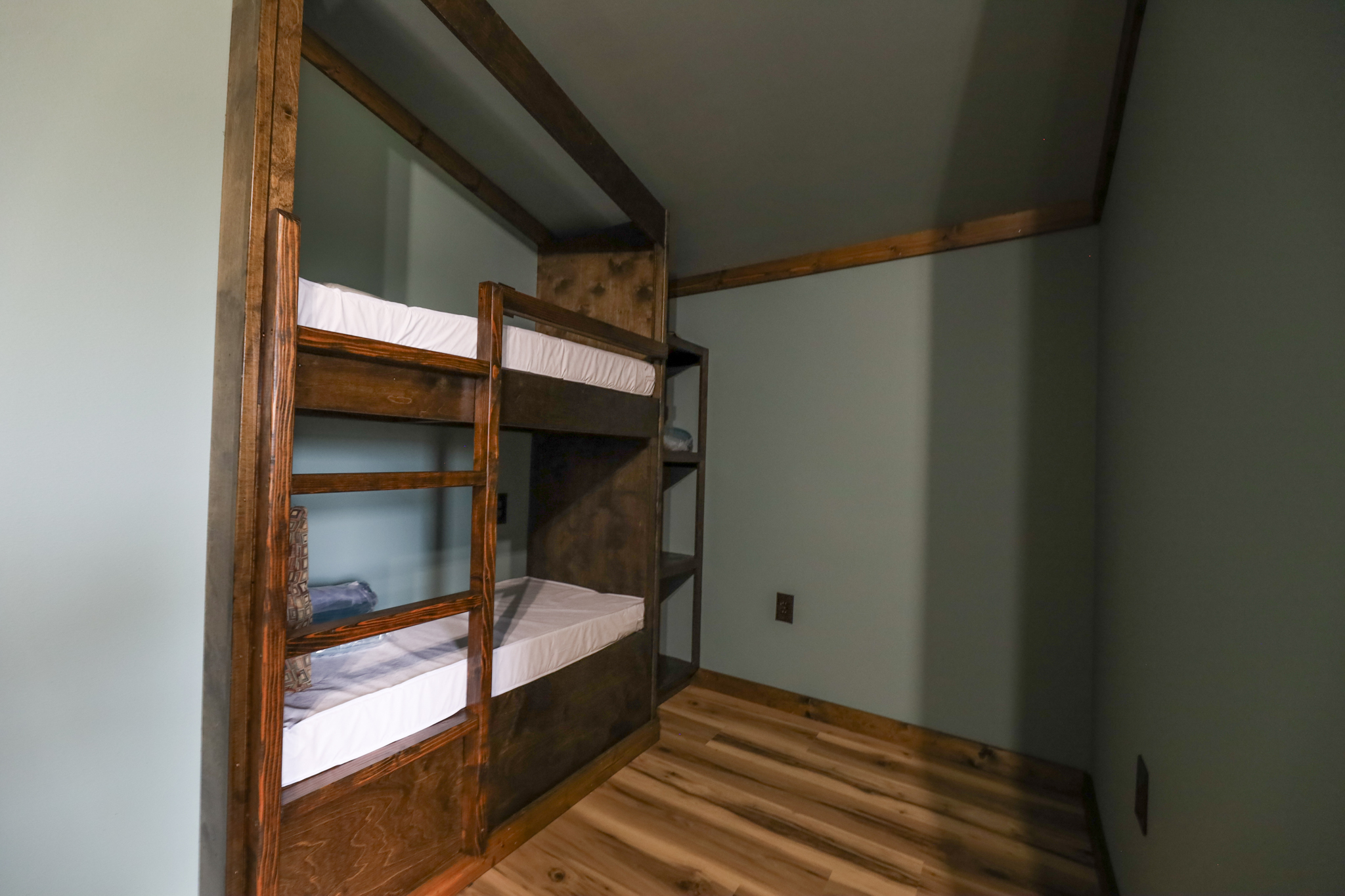 Upstairs there is a bedroom with built in bunk beds. The upstairs bathroom is a shower and toilet with a sink.