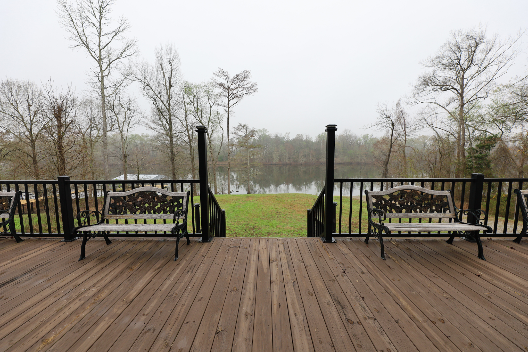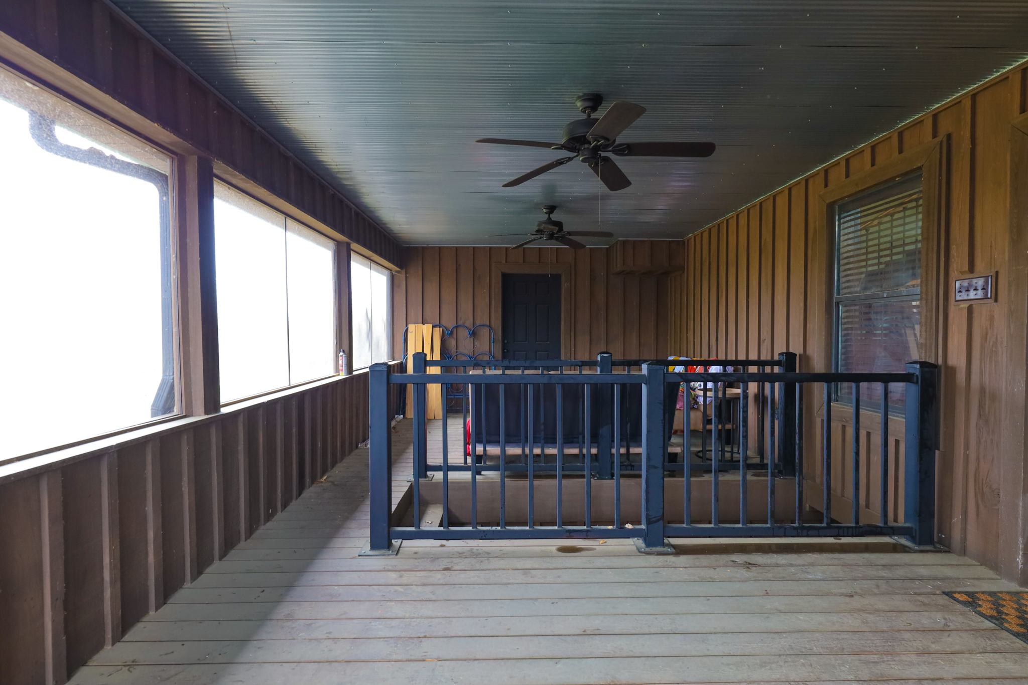 The front porch has access from living room as well as the screened porch. There is plenty of room with a large set of stairs heading for the lake.